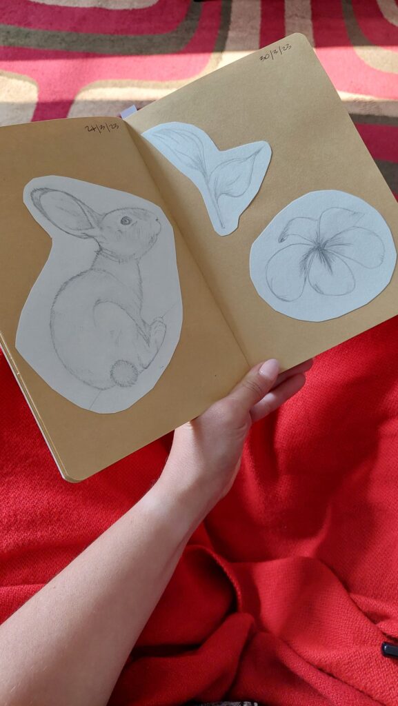 Desde hace ratos que quería escribir por aquí y compartir esto 😁 En honor a Austin Kleon, he robado varias ideas para tener mi momento creativo del día, sin presiones. Un momento solo para mi. Busqué un cuaderno que me gustó mucho y empecé a dibujar. Los de la foto son mis favoritos del año pasado que recorté del antiguo cuaderno y pegué en este. La verdad me gustó mucho el contraste de los colores del papel hahaha eso lo descubri por accidente 😅