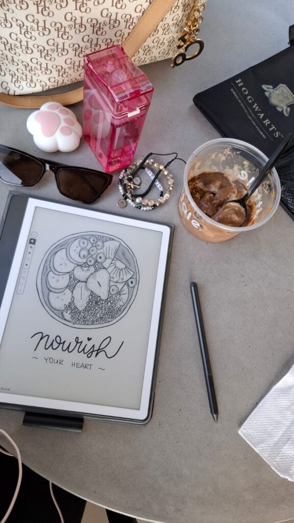 ¿Qué puedo decir? Este año no fue tan activo para el blog, sin embargo fue un año de mucho crecimiento personal 🙂 Entre todo lo que aprendí, está el hecho de que, si no tengo un tiempo determinado en el día para dedicarle a mis metas y las actividades que me gusta hacer, simplemente no lo hago. Un ejemplo es el día de esta foto. Después de ir a comprar finalmente los útiles del colegio de Paula (una tarea primordial), fui a comer un smoothie bowl acompañada de mis audífonos y mi Kindle para dibujar (recompensa). Dibujar en específico era algo que dejé de hacer por años, pero este 2025 logré perderle el miedo y retomarlo.