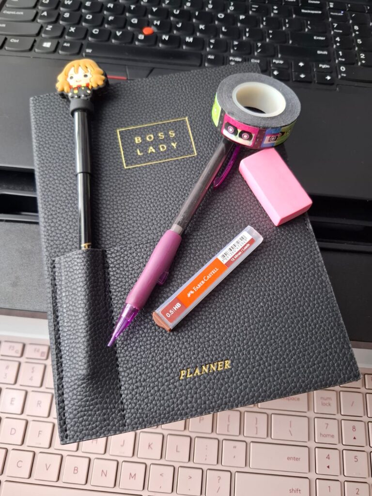 Mi agenda anterior era muy grande, con páginas que ni siquiera utilicé y un sistema que tampoco fue muy adaptable para mi estilo de vida. (Eso me pasa por caer en la trampa de las youtubers influencers hahaha) Al final, me di cuenta que prefiero usar la versión más sencilla que he encontrado: esta agenda de Dollar City sin fechas con un layout semanal y una página para notas 🙂 Y cómo solía hacer hace unos años, no podía faltar comprar mi washi tape oficial para la agenda o bullet journal, junto a la compra de un portaminas que me hacía falta. Todas pequeñas cosas, pero detalles que me hacen feliz y me motivan a escribir todos los días.