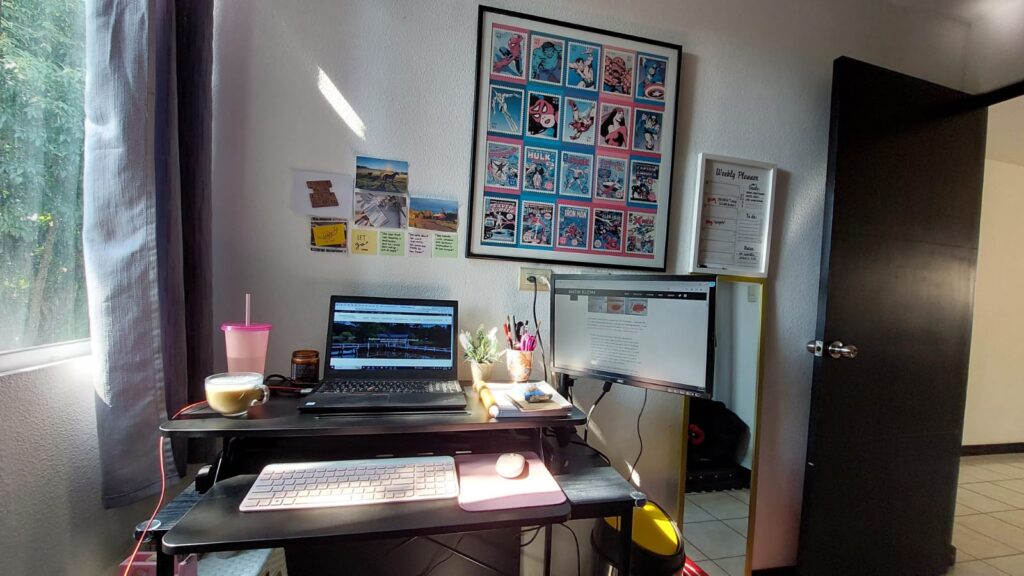 Más que depurar, fue analizar los espacios disponibles en la casa y reubicar todo. En el proceso, Paula se quedó sin su hoyo de juguetes debajo de las gradas, pero prefiero que todos sus juguetes estén en su cuarto. Nuestro pequeño gimnasio ya está de nuevo en funcionamiento, y aprovechando la esquina vacía decidí mover mi escritorio ahí. De esta forma le daría más espacio en el estudio a Crystian y asi poner otra estantería y reorganizar mejor todo su equipo de producción.